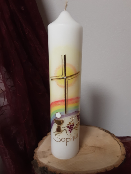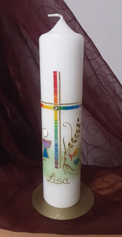 Nachfolgend eine kleine Auswahl der unzähligen Möglichkeiten. Weitere Motive finden Sie auch unter Taufkerzen, das Motiv kann zur Kommunion angepasst werden.