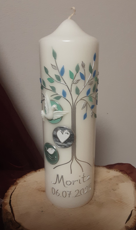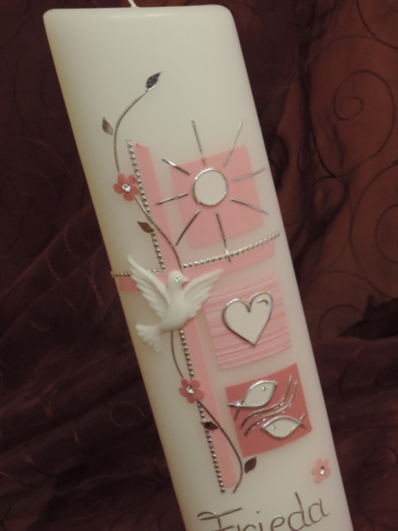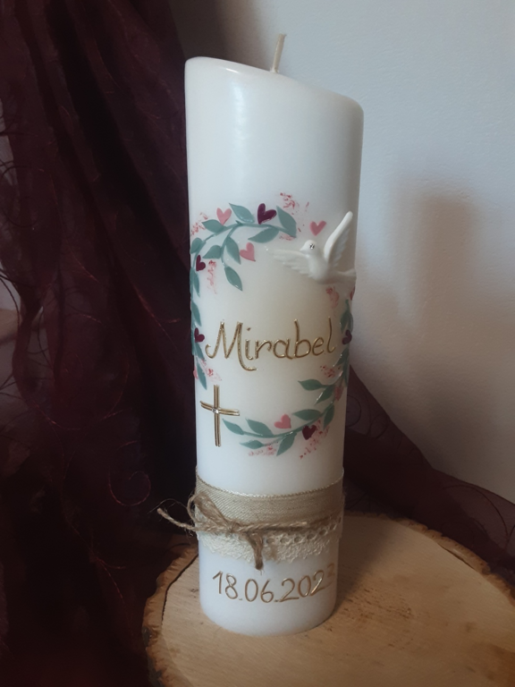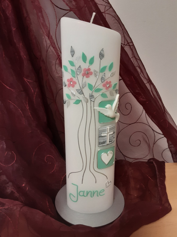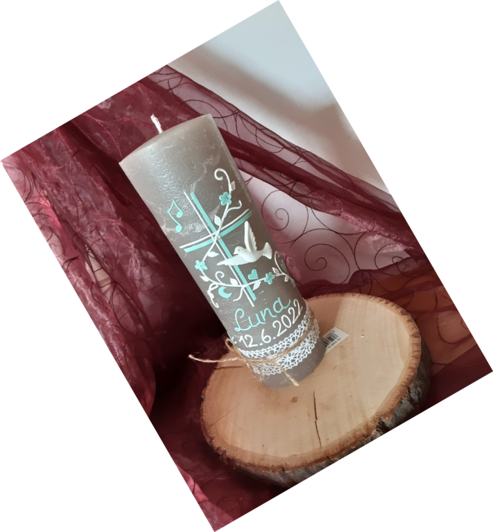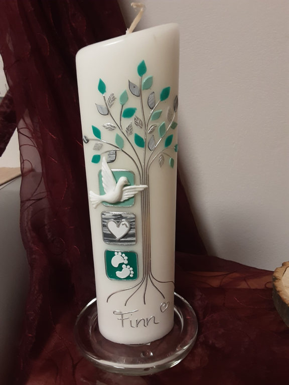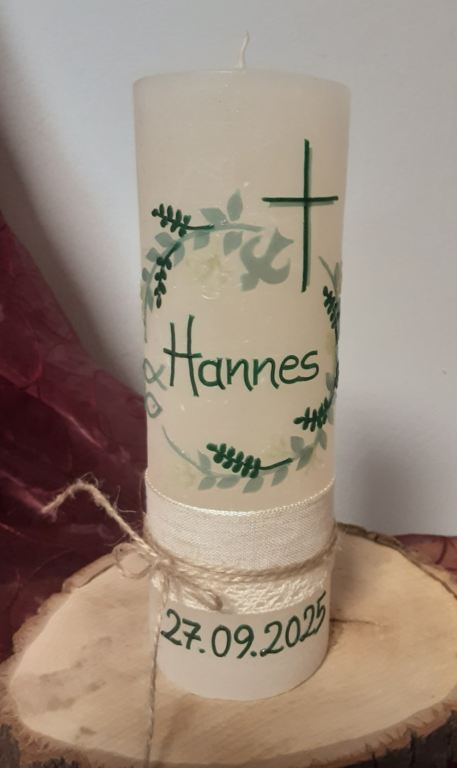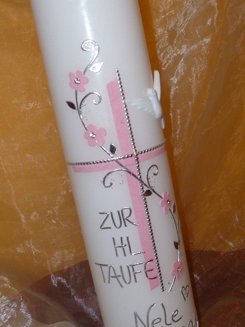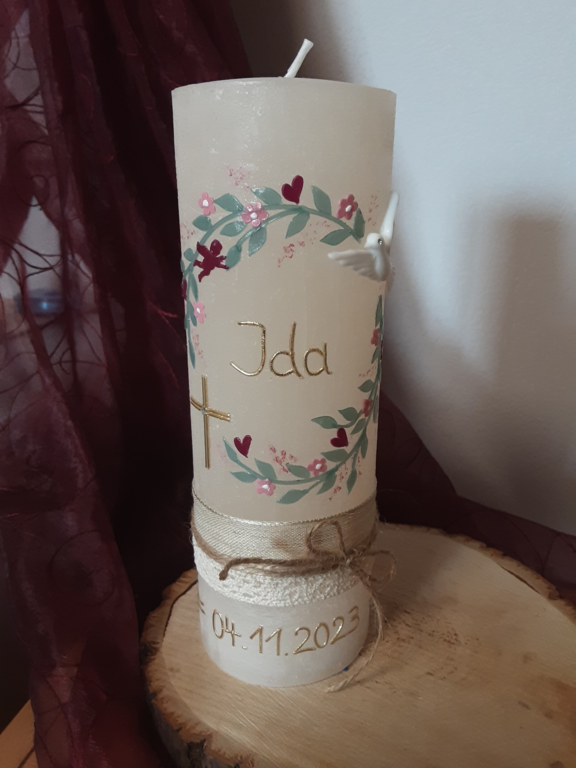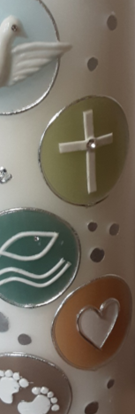 Ich habe viele verschiedene Motive, in verschiedenen Farben und Preislagen zur Auswahl, falls ein Foto des Täuflings auf der Kerze gewünscht wird, bitte ein Bild (noch nicht zurechtgeschnitten) mitbringen. Es ist auch möglich den Taufspruch, z.B. auf die Rückseite der Kerze, zu schreiben.