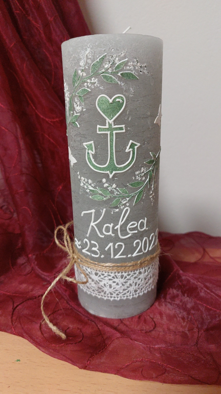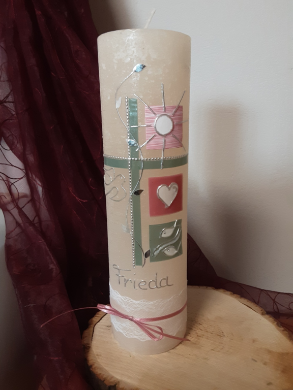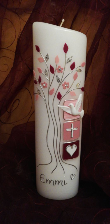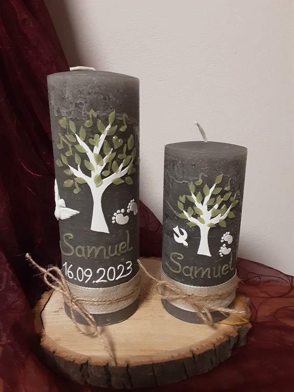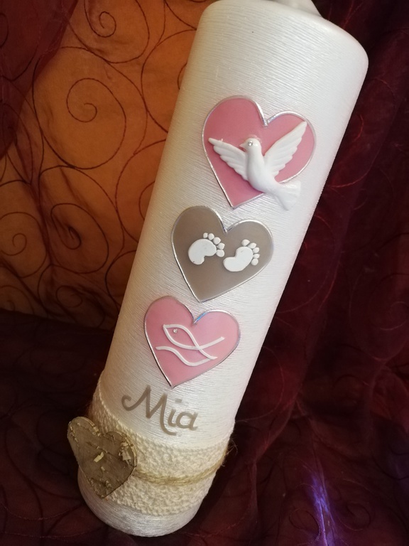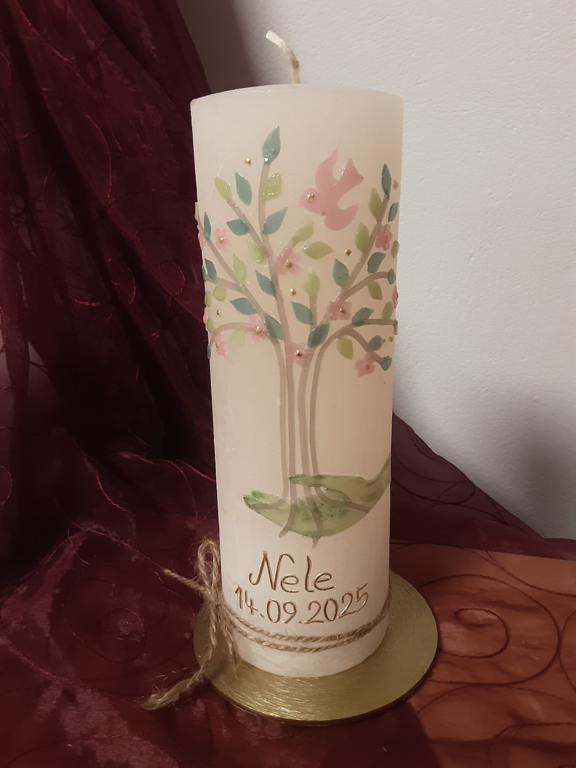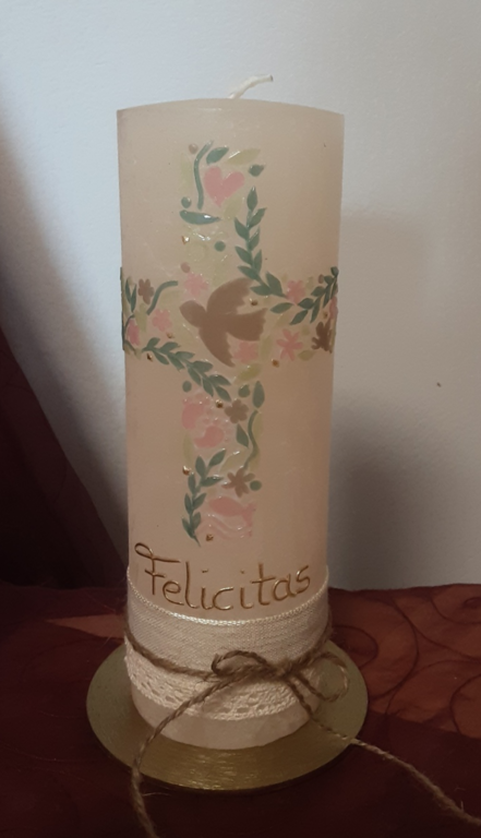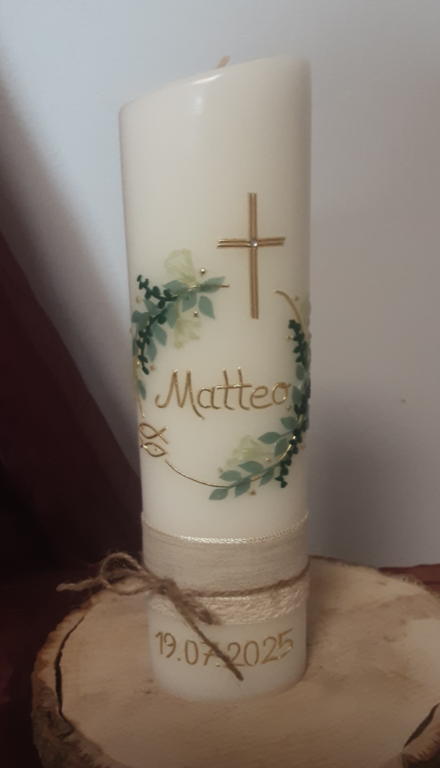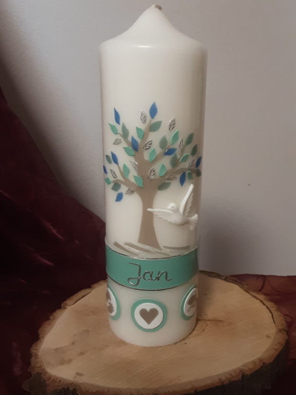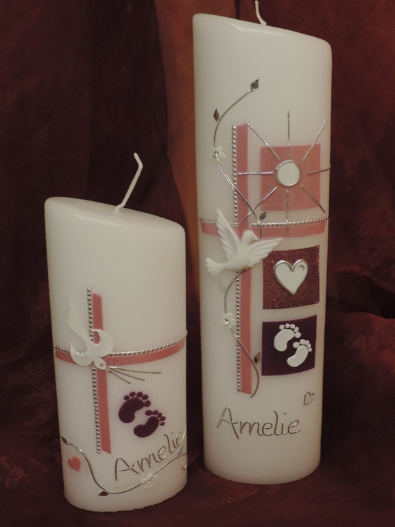 Ich habe viele verschiedene Motive, in verschiedenen Farben und Preislagen zur Auswahl, falls ein Foto des Täuflings auf der Kerze gewünscht wird, bitte ein Bild (noch nicht zurechtgeschnitten) mitbringen. Es ist auch möglich den Taufspruch, z.B. auf die Rückseite der Kerze, zu schreiben.